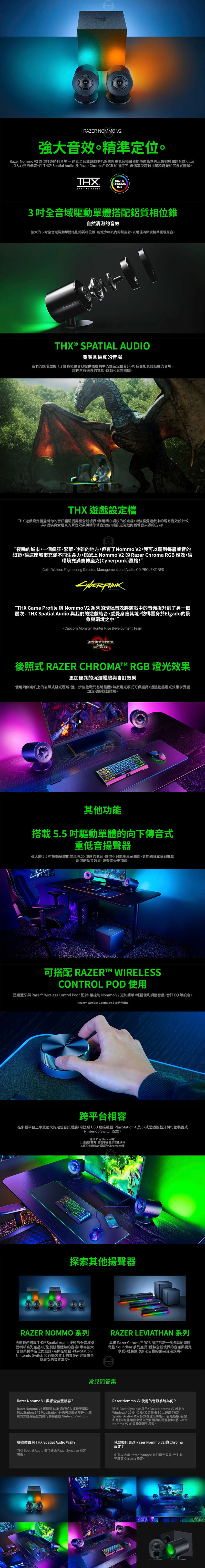 Razer Nommo V2 為你打造勝利音場 — 這套全音域遊戲喇叭系統與重低音揚聲器能帶來高傳真且響徹房間的音效,以及扣人心弦的低音。在 THX® Spatial Audio 及 Razer Chroma™ RGB 的加持下,盡情享受跨越視覺和聽覺的沉浸式體驗。