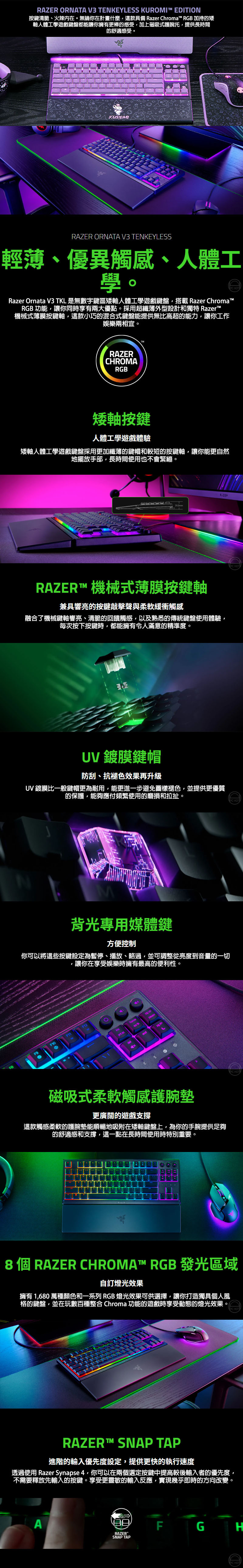 Razer Ornata V3 TKL 是無數字鍵區矮軸人體工學遊戲鍵盤,搭載 Razer Chroma™ RGB 功能,讓你同時享有兩大優點。採用超纖薄外型設計和獨特 Razer™ 機械式薄膜按鍵軸,這款小巧的混合式鍵盤能提供無比高超的能力,讓你工作娛樂兩相宜。