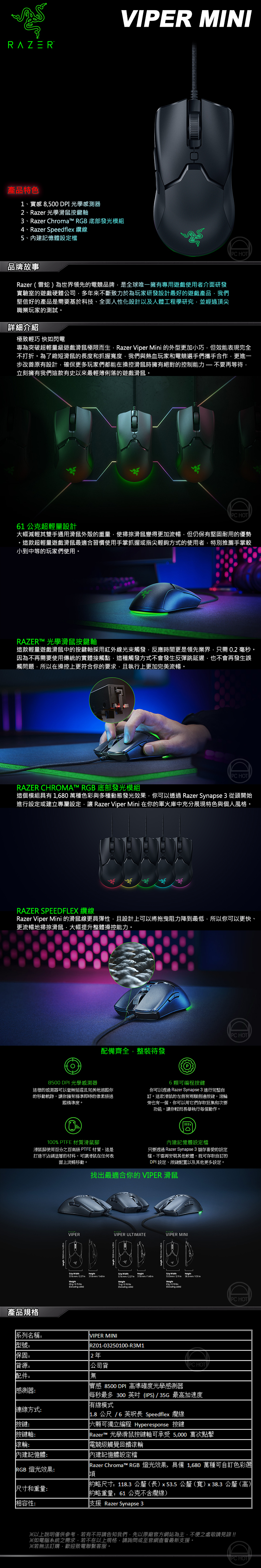 專為突破超輕量級遊戲滑鼠極限而生,Razer Viper Mini 的外型更加小巧,但效能表現完全不打折。為了縮短滑鼠的長度和抓握寬度,我們與熱血玩家和電競選手們攜手合作,更進一步改善原有設計,確保更多玩家們都能在操控滑鼠時擁有絕對的控制能力 — 不要再等待,立刻擁有我們這款有史以來最輕薄俐落的遊戲滑鼠。