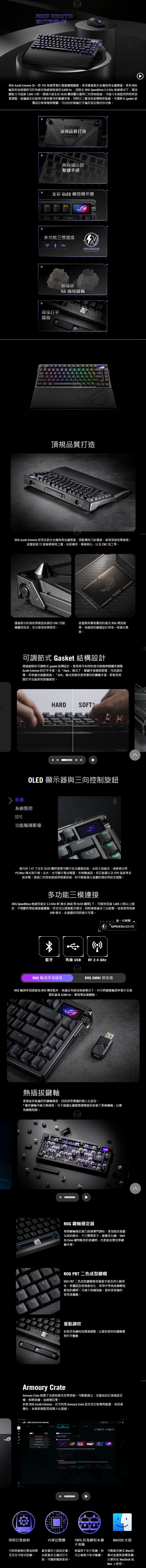 ROG Azoth Extreme 為一款 75% 無線客製化電競機械鍵盤,採用優質鋁合金機身與金屬側蓋。使用 ROG 輪詢率加速器時可於有線及無線連接達到 8,000 Hz ,同時在 ROG SpeedNova 2.4 GHz 無線模式下,電池續航力可超過 1,600 小時。透過升級全彩 OLED 觸控顯示器與三向控制旋鈕,可進行系統監控與即時設置調整。碳纖維定位板則可提供脆耳的擊鍵音質,同時以三層消音結構吸收振動。可調節式 gasket 結構設計附帶撥桿開關,可自由於兩種打字偏好設定間自由切換。