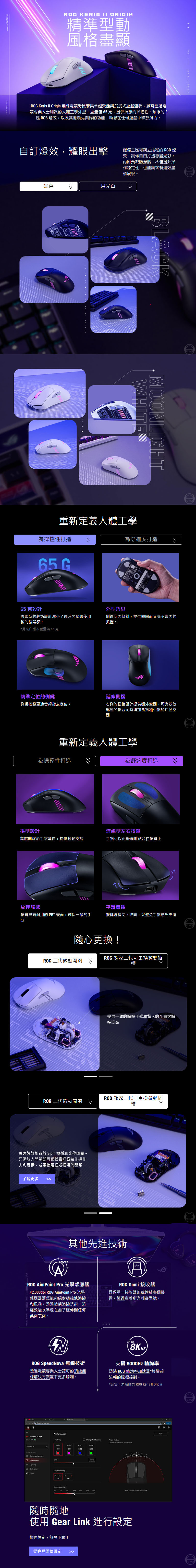 ROG Keris II Origin 無線電競滑鼠兼具卓越效能與沉浸式遊戲體驗,擁有經過電競專業人士測試的人體工學外型,重量僅 65 克,提供頂級的操控性、耀眼的 3 區 RGB 燈效,以及其他領先業界的功能,助您在任何遊戲中釋放潛力。