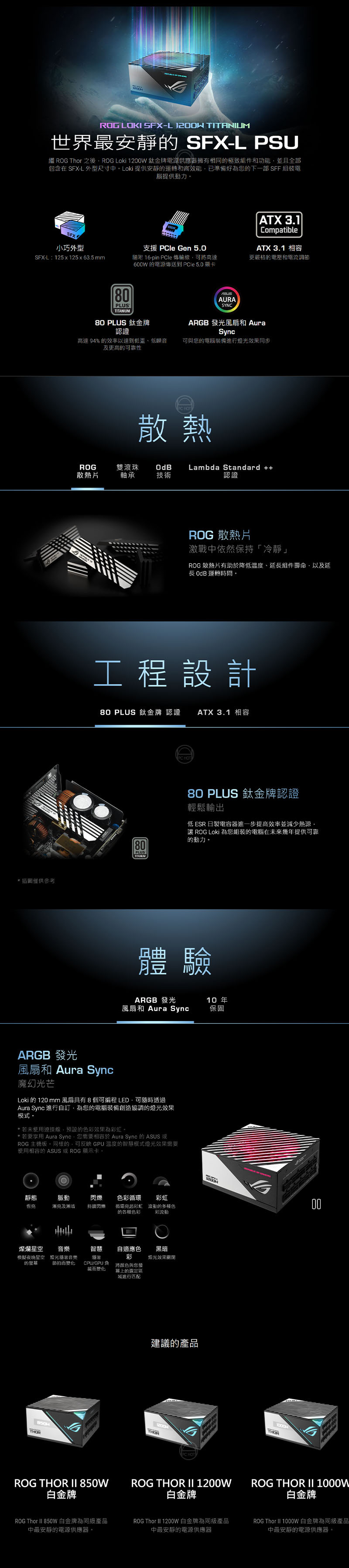 繼 ROG Thor 之後,ROG Loki 1200W 鈦金牌電源供應器擁有相同的極致組件和功能,並且全部包含在 SFX-L 外型尺寸中。Loki 提供安靜的運轉和高效能,已準備好為您的下一部 SFF 組裝電腦提供動力。