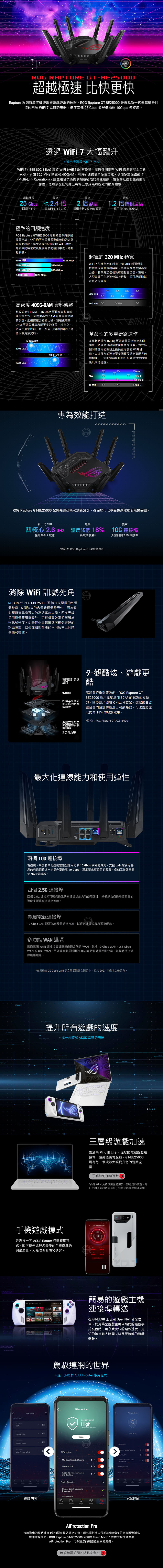 Rapture 系列持續突破連網與遊戲連網的極限。ROG Rapture GT-BE25000 是專為新一代運算量身打造的四頻 WiFi 7 電競路由器,速度高達 25 Gbps 並具備兩個 10Gbps 連接埠。