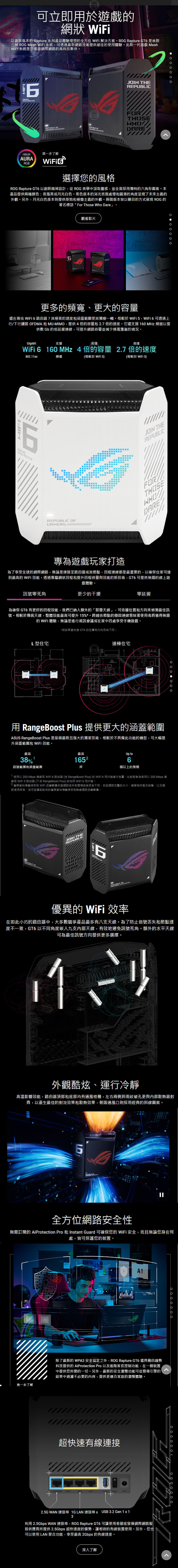可立即用於遊戲的,網狀 WiFi,以最新版本的 Rapture 系列產品體驗理想的全方位 WiFi 解決方案。ROG Rapture GT6 是首款三頻 ROG Mesh WiFi 系統,可透過最新網路技術提供絕佳的使用體驗。此新一代遊戲 Mesh WiFi 系統是您遨遊網際網路的高科技夥伴。