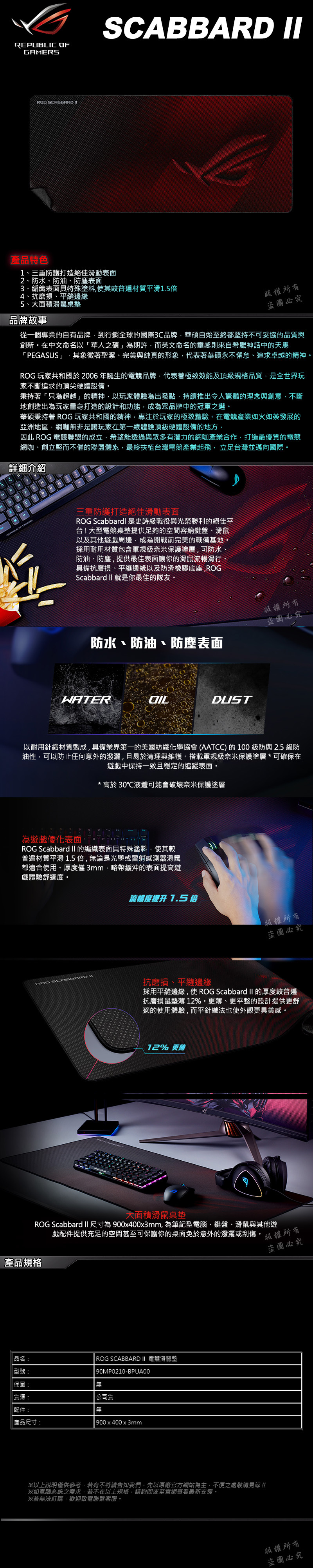 ROG Scabbardl是史詩級戰役與光榮勝利的絕佳平台!大型電競桌墊提供足夠的空間容納鍵盤、滑鼠以及其他遊戲周邊,成為開戰前完美的戰備基地。採用耐用材質包含軍規級奈米保護塗層,可防水、防油、防塵,提供最佳表面讓你的滑鼠流暢滑行。具備抗磨損、平縫邊緣以及防滑橡膠底座,ROG Scabbard ll就是你最佳的隊友。