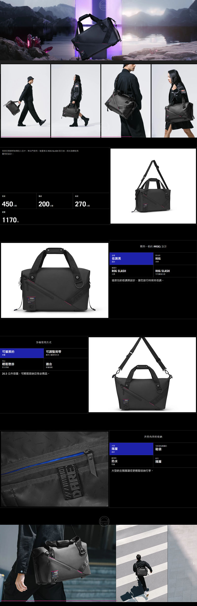 有時您需要將裝備放入包中,帶出門使用。隆重推出 ROG SLASH 旅行袋,時尚演繹經典實用的設計。