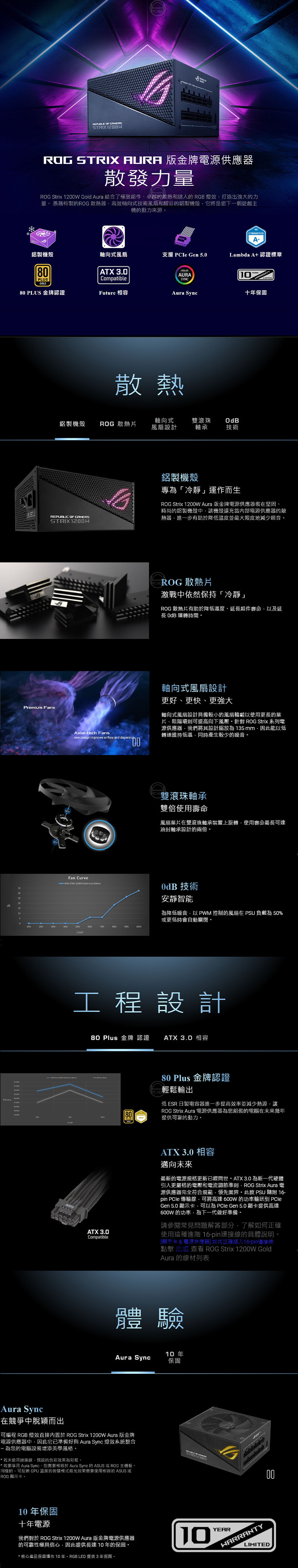 最新的電源規格更新已經問世。ATX 3.0 為新一代硬體引入更嚴格的電壓和電流調節準則,ROG Strix Aura 電源供應器完全符合規範,領先業界。此款 PSU 隨附 16-pin PCIe 傳輸線,可將高達 600W 的功率輸送到 PCIe Gen 5.0 顯示卡,可以為 PCIe Gen 5.0 顯卡提供高達 600W 的功率,為下一代做好準備。
