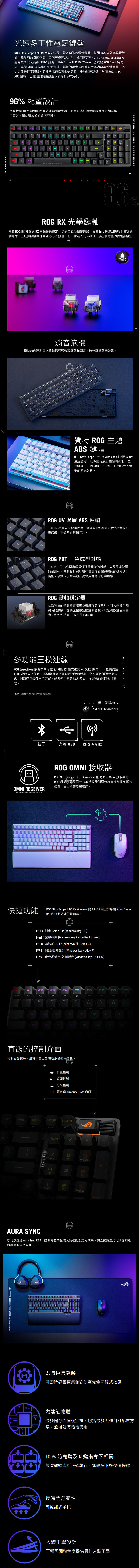 ROG Strix Scope II 96 RX Wireless 是一款多功能的電競鍵盤,採用 96% 高效率配置設計以釋放您的桌面空間。具備三模連線功能,採用藍牙®、2.4 GHz ROG SpeedNova 無線技術以及有線 USB-C 連線。Strix Scope II 96 RX Wireless 也支援 ROG Omni 接收器,配備 ROG RX 光學紅軸或青軸,獨特的消音矽膠墊設計與內建鍵軸減震墊,提供更佳的打字體驗。額外功能包括直播快捷鍵、多功能控制鍵、附加 ROG 主題 ABS 鍵帽、三種傾斜角度調整以及可拆卸式手托。