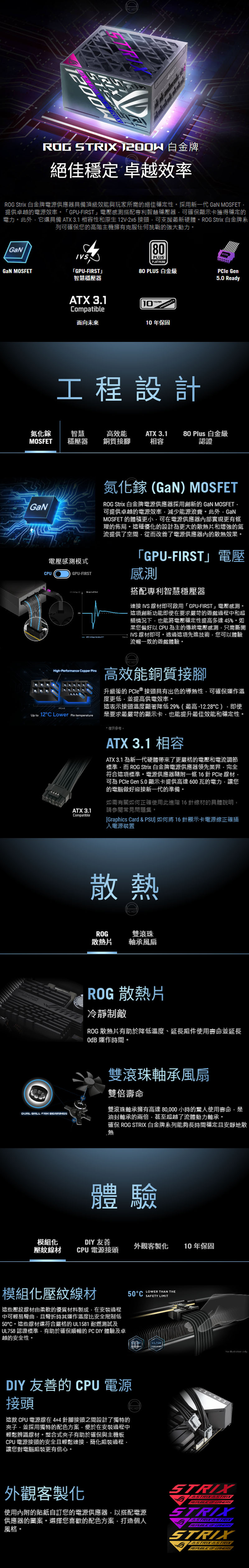 ROG Strix 白金牌電源供應器具備頂級效能與玩家所需的絕佳穩定性。採用新一代 GaN MOSFET,提供卓越的電源效率。「GPU-FIRST」電壓感測搭配專利智慧穩壓器,可確保顯示卡獲得穩定的電力。此外,它還具備 ATX 3.1 相容性和原生 12V-2x6 接頭,可支援最新硬體。ROG Strix 白金牌系列可確保您的高階主機擁有克服任何挑戰的強大動力。