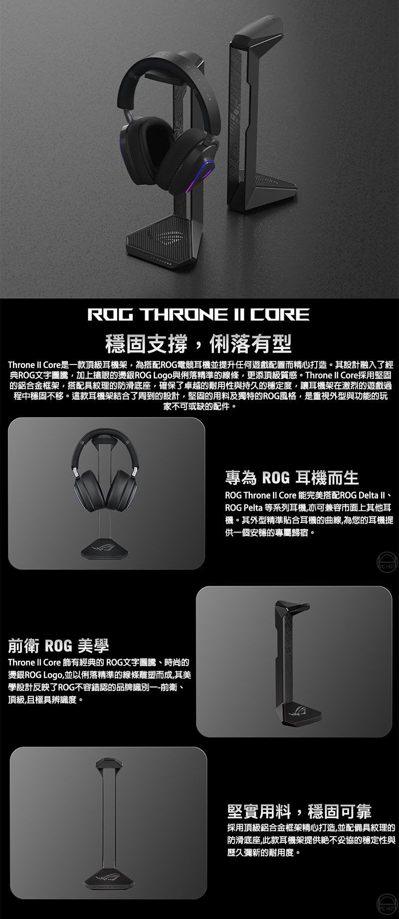 1. 專為 ROG 耳機而生:堅固的支架,是您在不使用耳機時,完美展示 ROG 電競信仰的最佳歸宿。