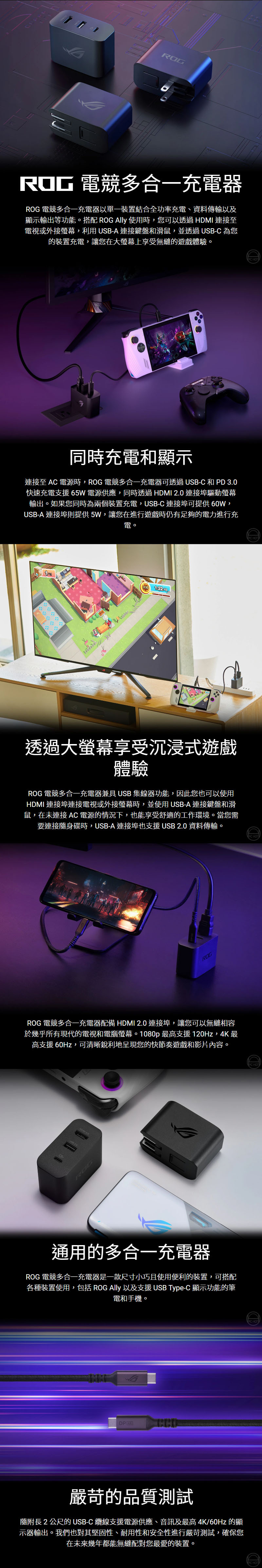 1.ROG 電競多合一充電器以單一裝置結合全功率充電、資料傳輸以及顯示輸出等功能。