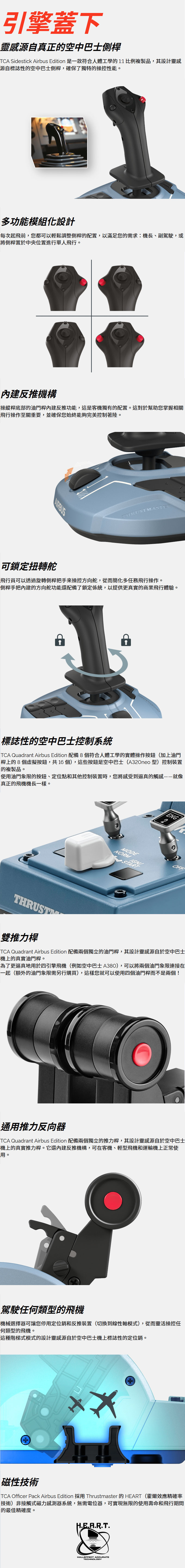 TCA Officer Pack Airbus Edition 採用 Thrustmaster 的 HEART(霍爾效應精確率技術)非接觸式磁力感測器系統,無需電位器,可實現無限的使用壽命和飛行期間的最佳精確度。