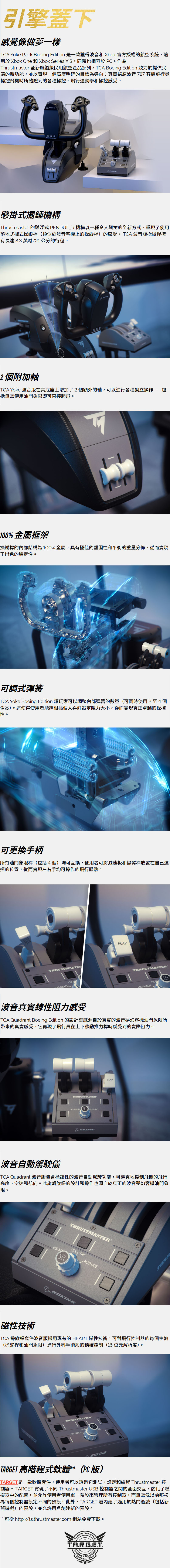 TCA Quadrant Boeing Edition 的設計靈感源自於真實的波音夢幻客機油門象限所帶來的真實感受,它再現了飛行員在上下移動推力桿時感受到的實際阻力。