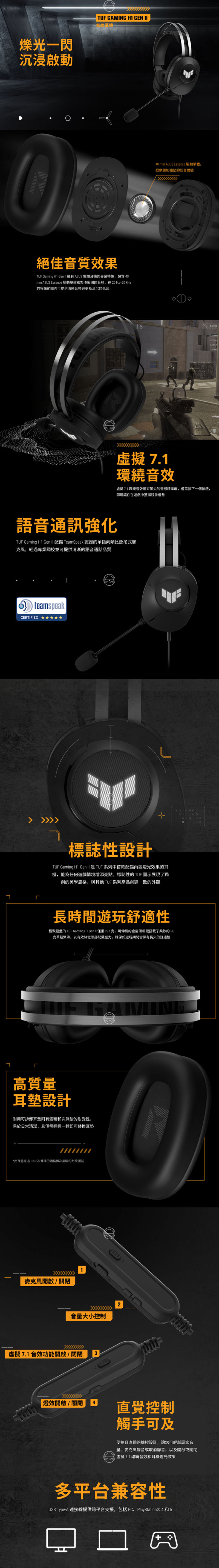 TUF Gaming H1 Gen II 配備 TeamSpeak 認證的單指向類比懸吊式麥克風,經過專業調校並可提供清晰的語音通話品質。