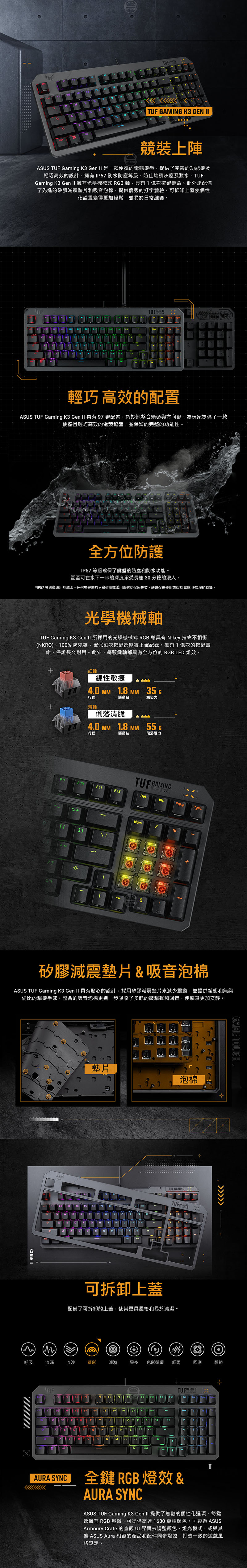 ASUS TUF Gaming K3 Gen II 是一款便攜的電競鍵盤,提供了完善的功能鍵及輕巧高效的設計。擁有 IP57 防水防塵等級,防止堆積灰塵及濺水。TUF Gaming K3 Gen II 擁有光學機械式 RGB 軸,具有 1 億次按鍵壽命、此外還配備了先進的矽膠減震墊片和吸音泡棉,提供優秀的打字體驗。可拆卸上蓋使個性化設置變得更加輕鬆,並易於日常維護。